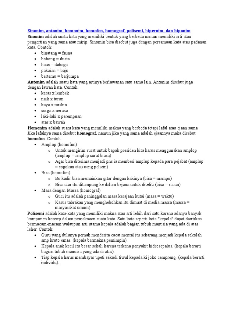 Check spelling or type a new query. Contoh sinonim antonim homonim homofon homograf polisemi. We did not find results for: Maybe you would like to learn more about one of these?